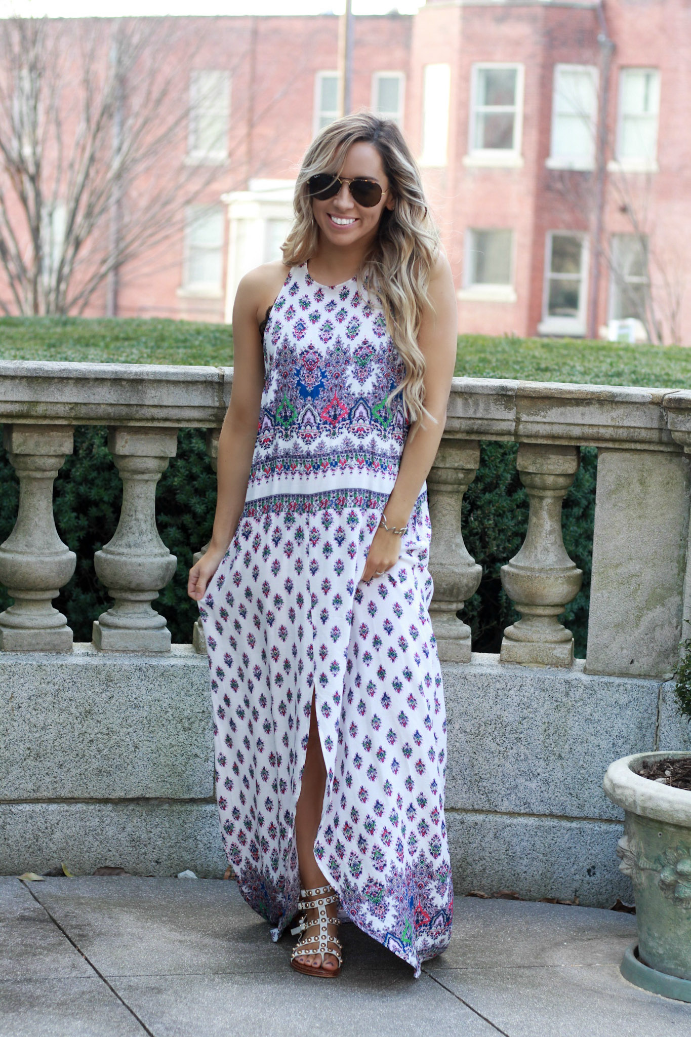 Anyways – about this look! I recently discovered the brand Le Salty Label and I’m hooked. This maxi is gorgeous, flowy, I love the fit and the slits. It’s so perfect for spring and summer as a coverup, or as a dress. They actually have a lot of things on sale right now so you should definitely check them out! Since my due date is in May, I knew it would be getting warmer but I really didn’t have a whole lot of spring stuff. Now that spring has apparently come early, I’m so glad to find pieces like this that work now, and will work after the baby comes. Flowy maxi dresses like this are perfect for a bump, or hiding that after baby tummy.