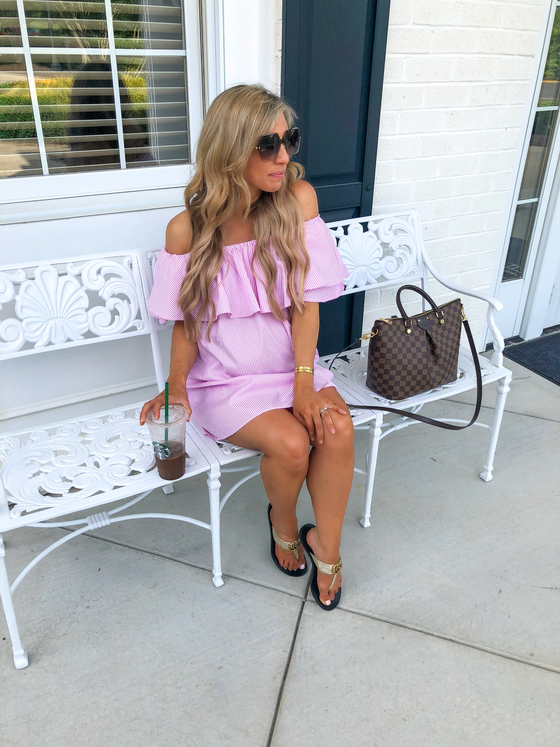 Off the Shoulder Dress (also in blue) // Louis Vuitton Siena MM // Gucci Marmont Sandals // Chloe dupe Sunglasses (only $14!)