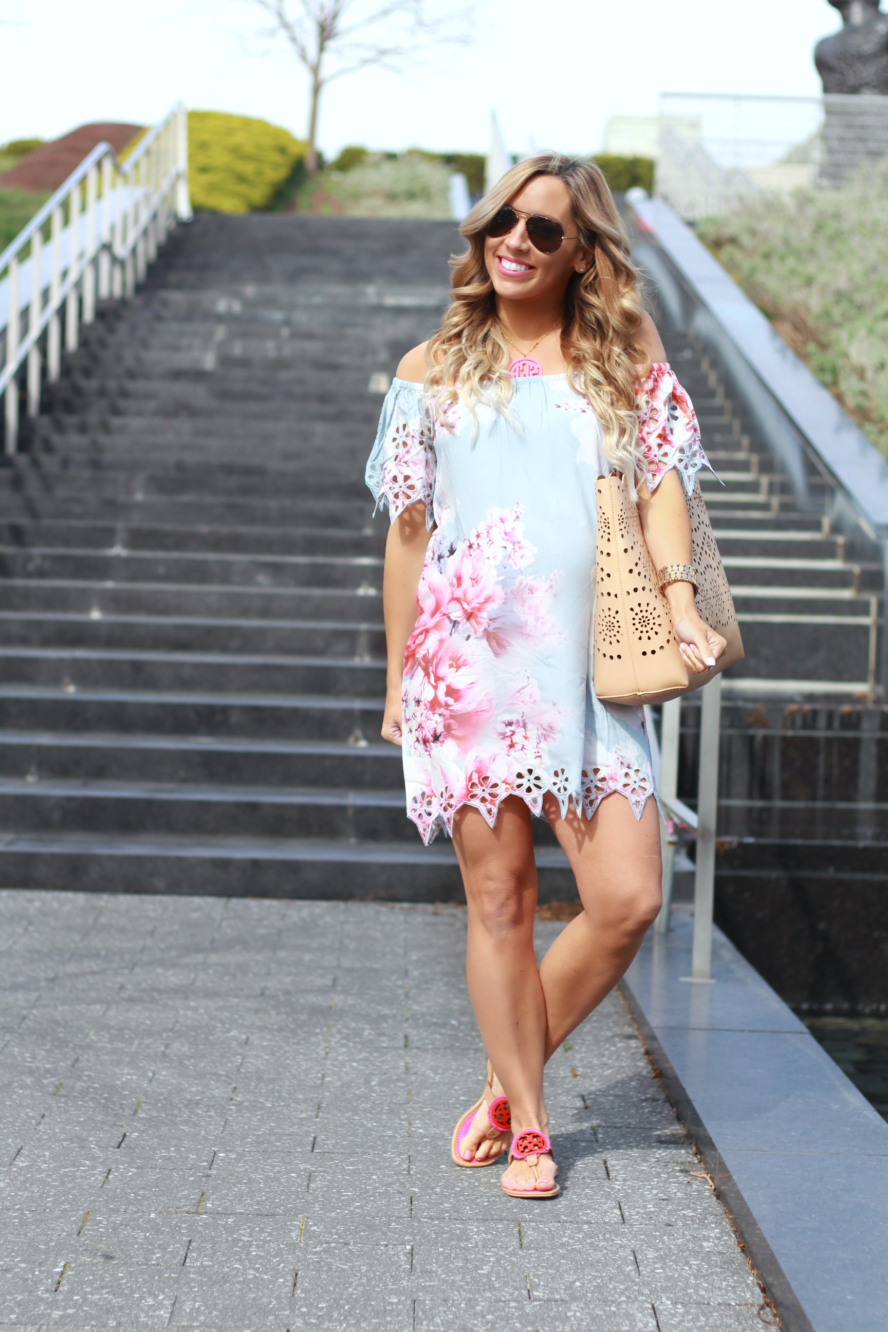 DRESS: Plum Pretty Sugar | SANDALS: Tory Burch | TOTE: Nordstrom | SUNGLASSES: Ray Ban | NECKLACE: Harper & Jewels