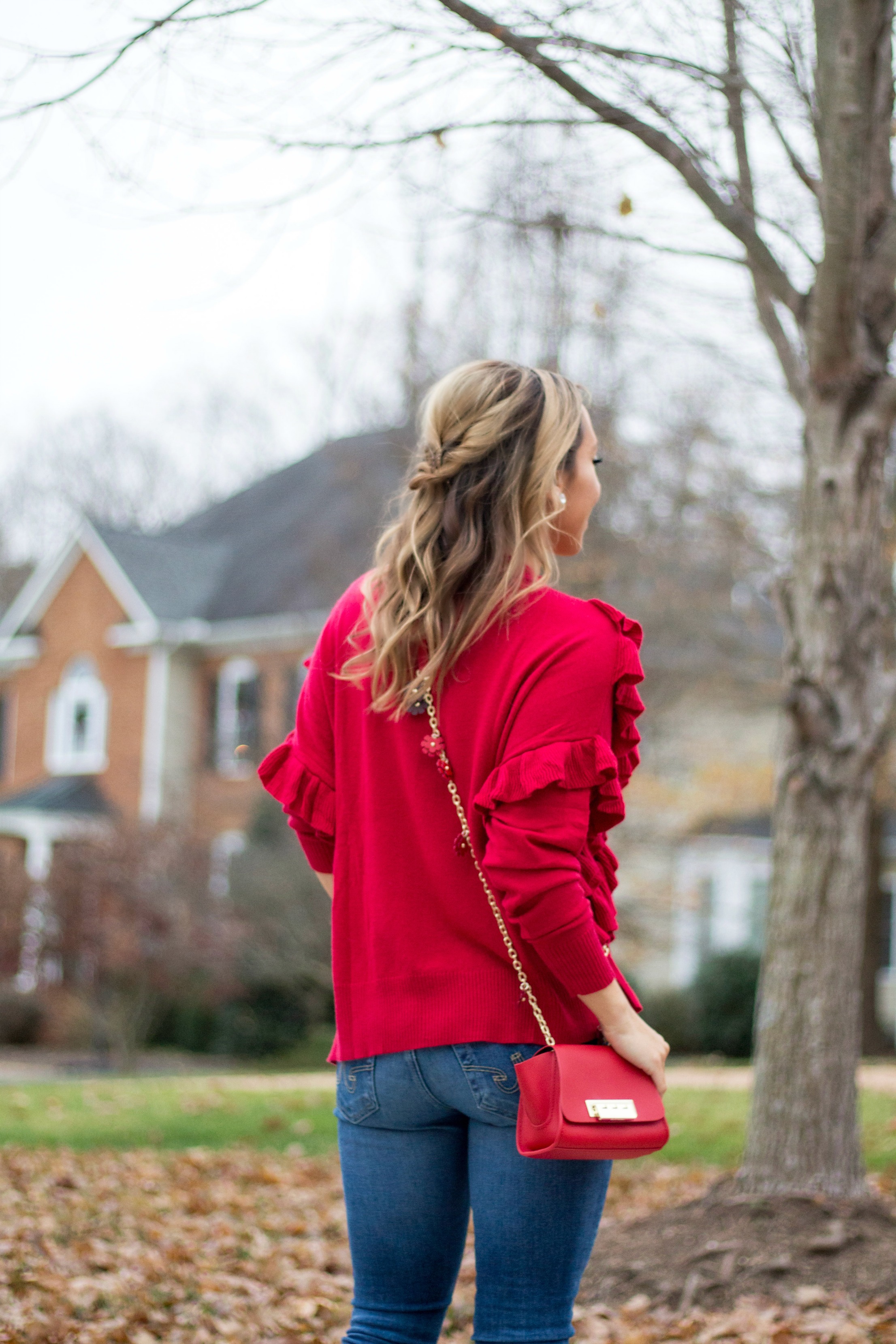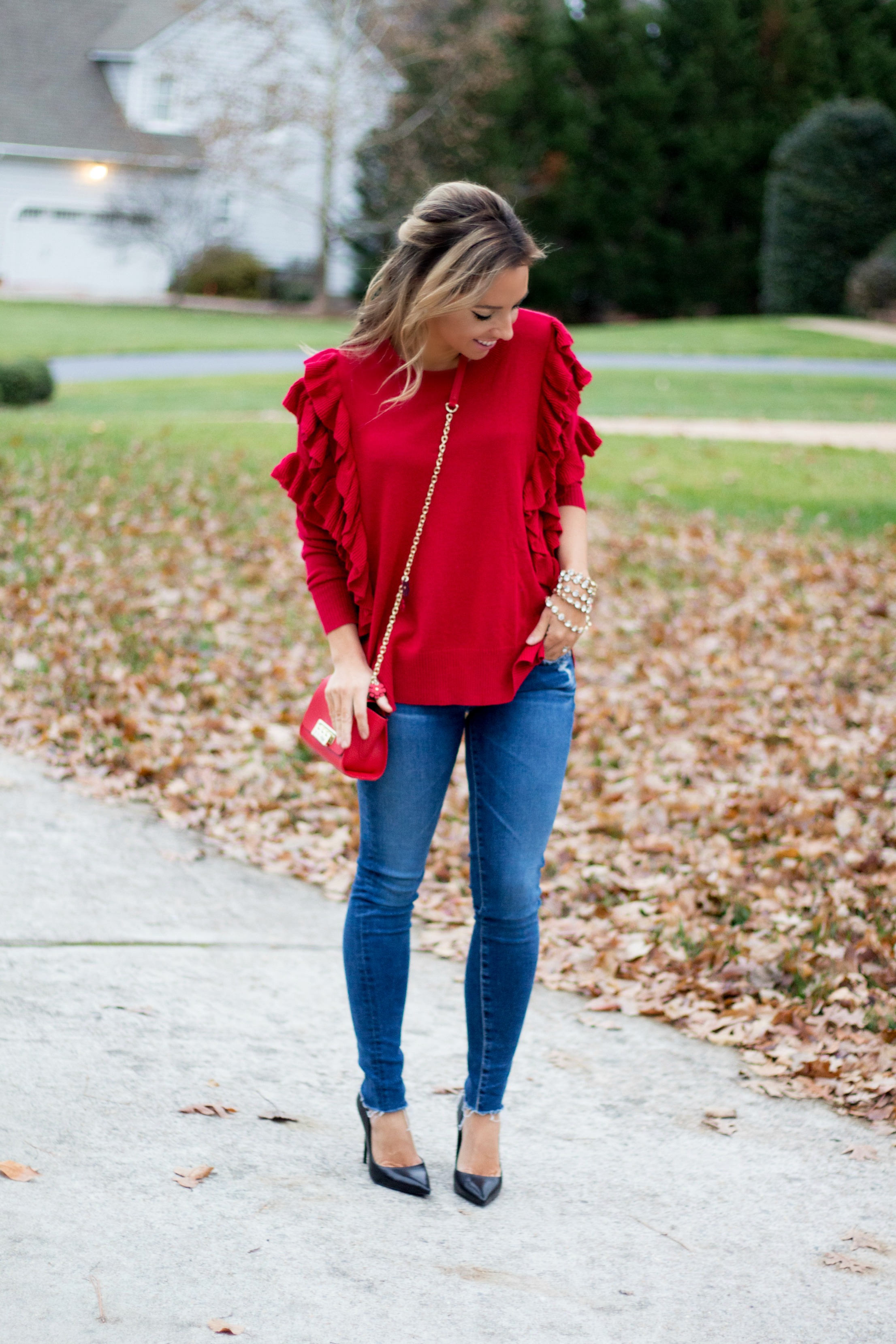 Ruffle Sweater (40% off) // Raw Hem Skinny Jeans (currently 33% off) // Zac Zac Posen Crossbody (also in black and only $100) // Stud Earrings // Steve Madden Black Pumps