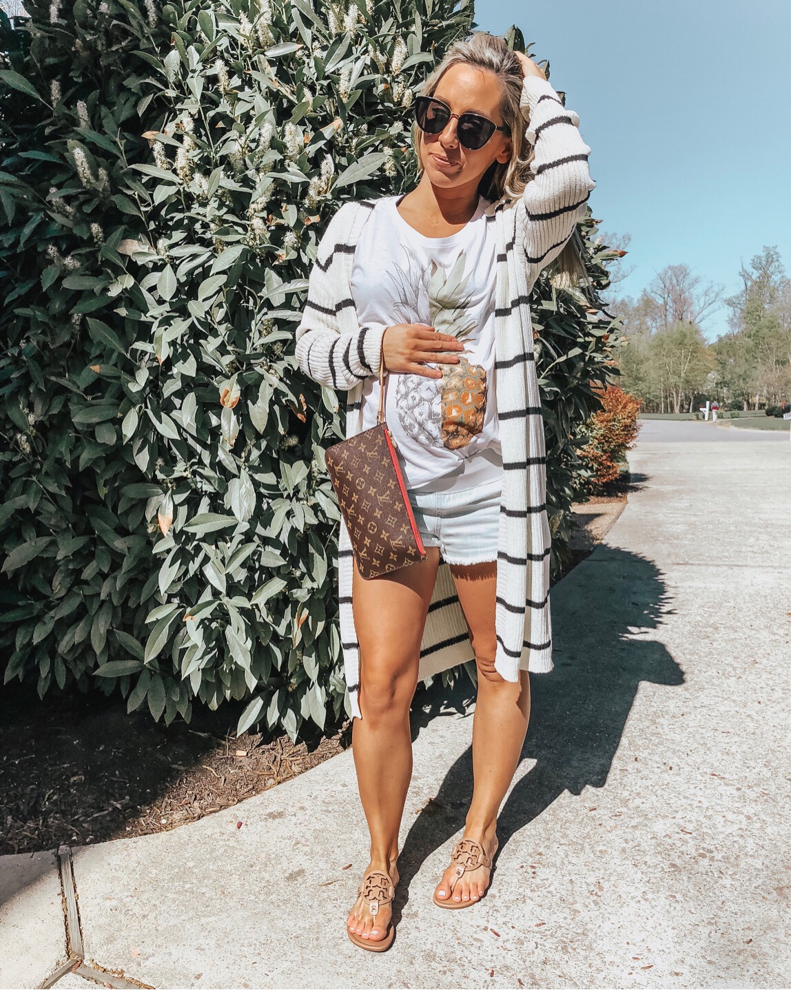 Pineapple Tshirt // She is Btq Cardigan // Tory Burch Sandals //ASOS Denim Shorts // Sunglasses