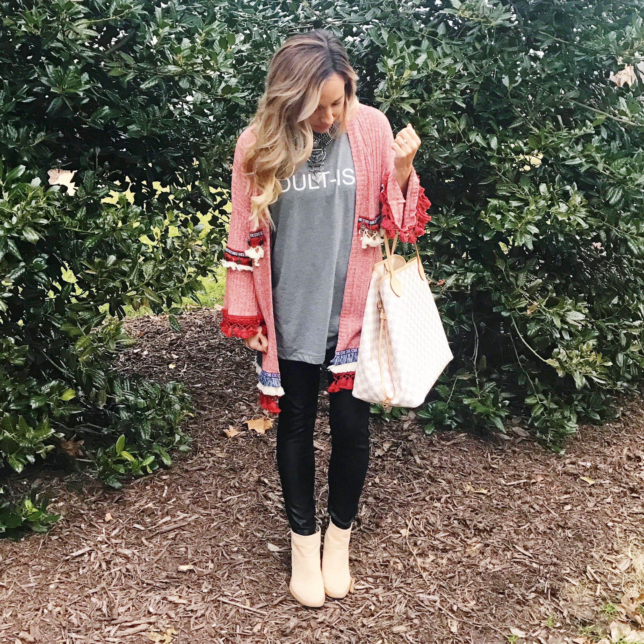 Fringe Cardigan // Booties // Leather Leggings (Maternity & Non Maternity option here) // Adult-ish Tee // BaubleBar Necklace