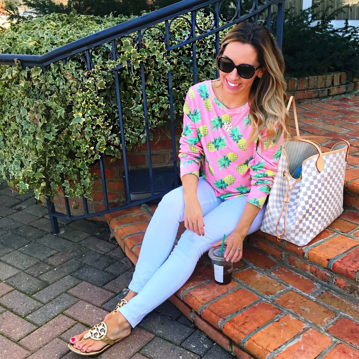 Wildfox Pineapple Sweater // Tory Burch Miller / White Jeans // Prada Sunglasses