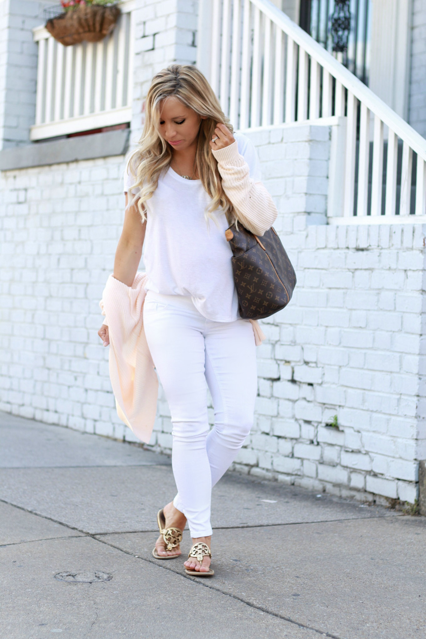 Cardigan (almost sold out) similar HERE // Tory Burch Miller Flats // Asos Denim (exact pair available in maternity or non-maternity for only $37!) // White T-shirt // Monogrammed Necklace // Louis Vuitton // Sunglasses